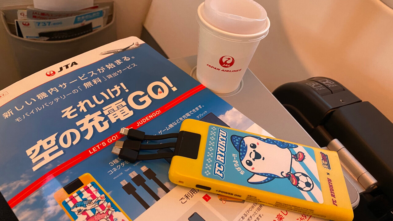 飛行機の席にもUSB-AとCの二口ついているのですが、ケーブルが無い!って人向けにモバイルバッテリーの準備があります。