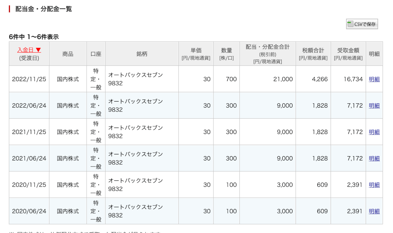 オートバックスセブンの株を持ち続けると、100株あたり年間6,000円(2022年実績)を受け取ることが出来ることです。
